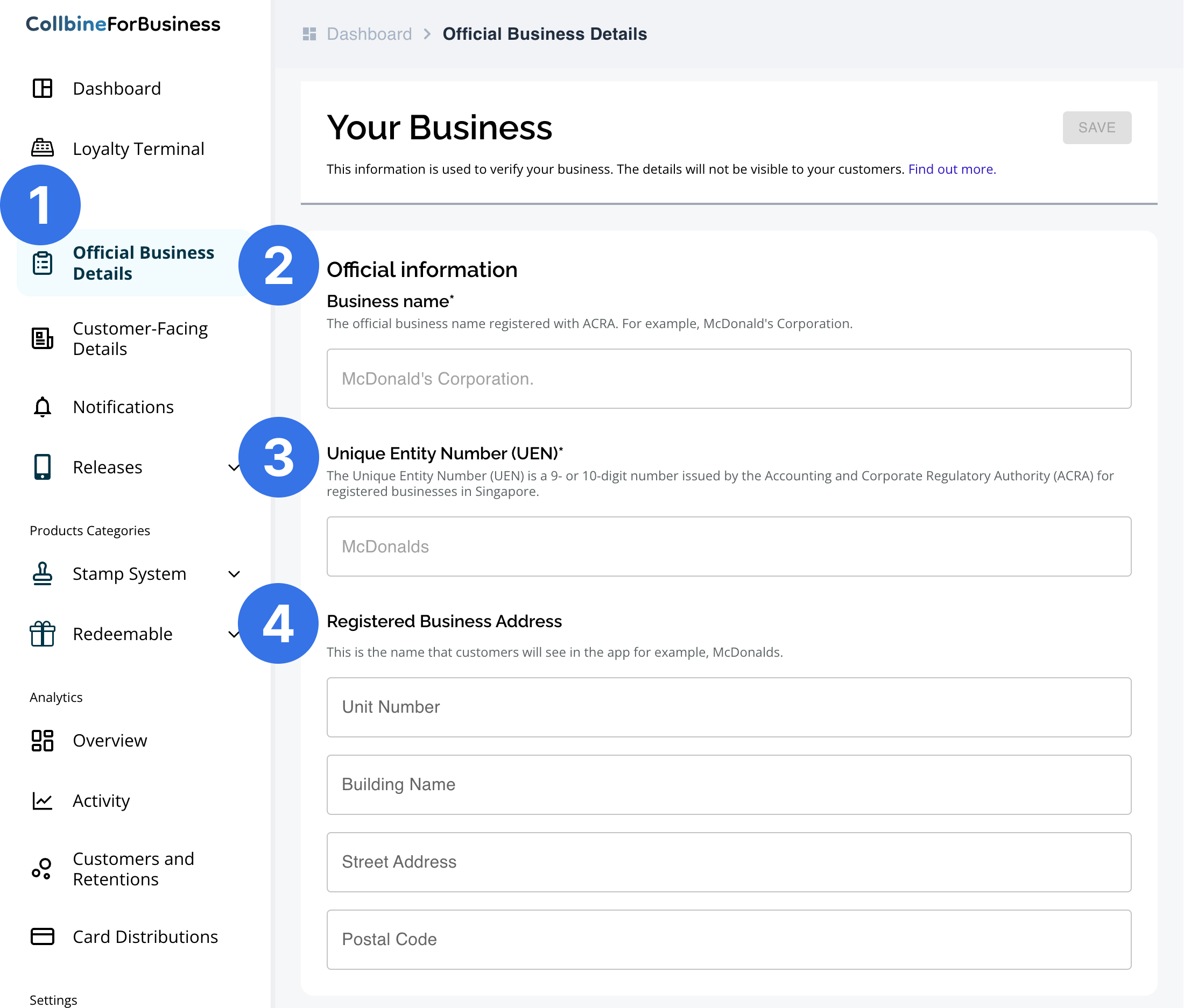 Official Business Details are used to verify your business before your loyalty program can be released on Collbine. This information is reviewed by the Collbine team and is not visible to customers.